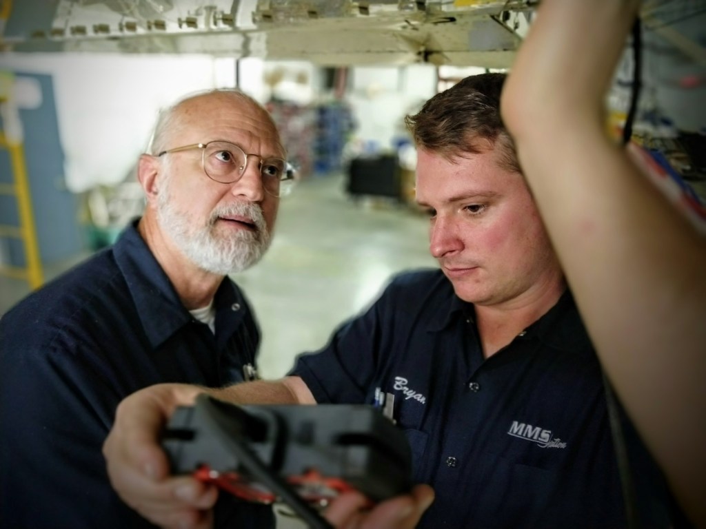Recently I aided Tim Obarow with an annual inspection on a plane that serves in Haiti. During the inspection, we had to inspect the rivets inside of the horizontal stabilizer. No matter how much butter we applied neither of our heads fit in the two-inch hole, so Tim is pictured here teaching me how to use a small inspection camera.